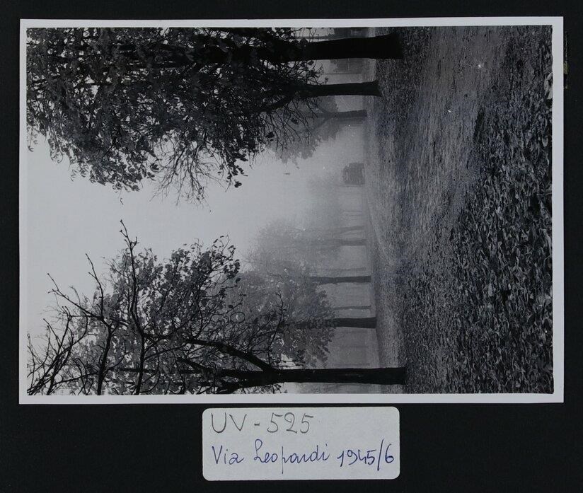 Udine: veduta di viale Giacomo Leopardi con filari di alberi, a destra e a sinistra, e, sullo sfondo, un mezzo militare.