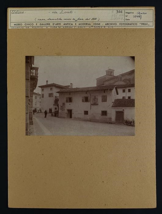 Udine: casa demolita alla fine del XIX secolo, su cui ci sono delle affissioni pubbliche. A sinistra, tre uomini che camminano. A destra, in primo piano, una donna e tre bambini seduti. Sullo sfondo, a destra, si intravede il Santuario della Beata Vergine delle Grazie.