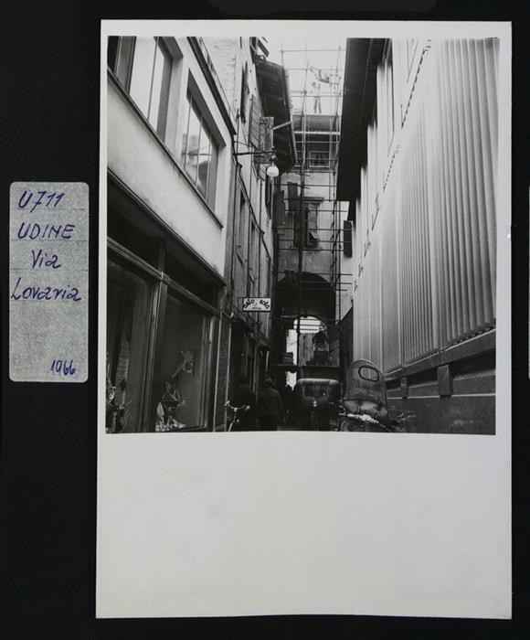 Udine, via Lovaria: stradina che collega via Vittorio Veneto a piazza Patriarcato, con negozi di abbigliamento a sinistra, durante delle attività cantieristiche (vedasi, al centro, l'impalcatura). In basso al centro, un motocarro Moto Guzzi.