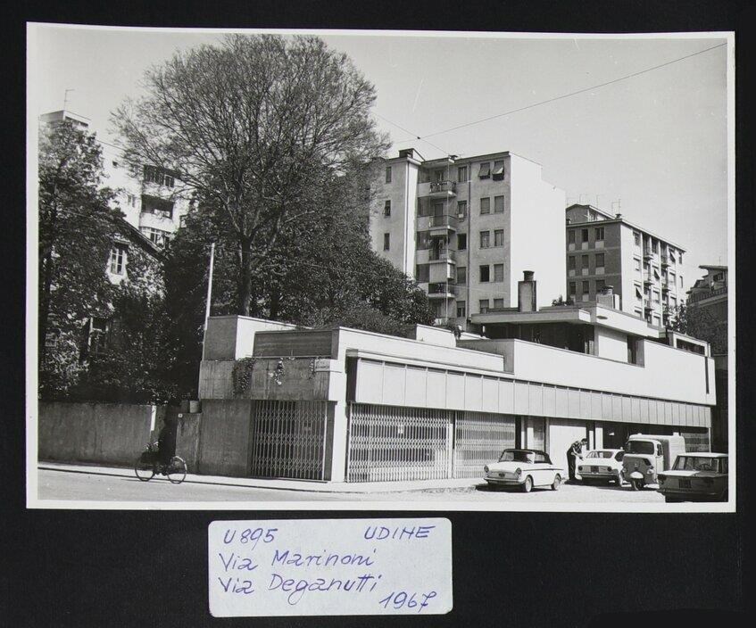 Udine, angolo via Jacopo Marinoni e via Cecilia Deganutti: a destra, via Deganutti, al tempo un vicolo, che successivamente venne esteso arrivando a Largo dei Pecile. Oltre il muro che si intravede a destra era posto un albero appartenente al parco di Palazzo Pecile.