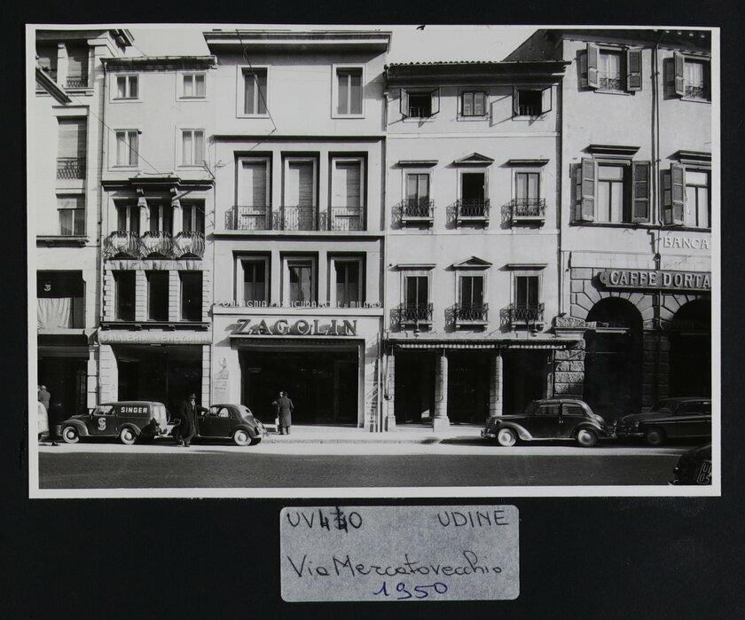 Udine: scorcio di via Mercatovecchio. A destra, facciata della Banca Commerciale Italiana e il caffè Dorta, che trae le sue origini nel 1864 grazie a Pietro Dorta (nel 1879 "Caffè e Premiata Pasticceria e Confetteria Pietro Dorta & C.") e che venne chiuso nel 1958, presso Palazzo Tealdi-Campiutti-Dorta (di origine quattrocentesca). Verso sinistra, la storica cappelleria Zagolin; sopra questa attività era collocata la casa del tipografo Giuseppe Seitz, prima posseduta dalla famiglia Decani e poi Caiselli.