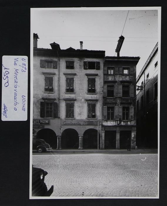 Udine: veduta di uno scorcio di via Mercatovecchio. Si presti attenzione alle insegne della camiceria D'Orlando e, a sinistra, della compagnia di navigazione Llyod Triestino.