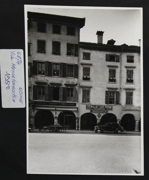 Udine: veduta di uno scorcio di via Mercatovecchio. Si presti attenzione alle insegne della camiceria D'Orlando, della compagnia di navigazione Llyod Triestino e del Nuovo Caffè Commercio. A sinistra, in sosta, un carro trainato da cavalli.