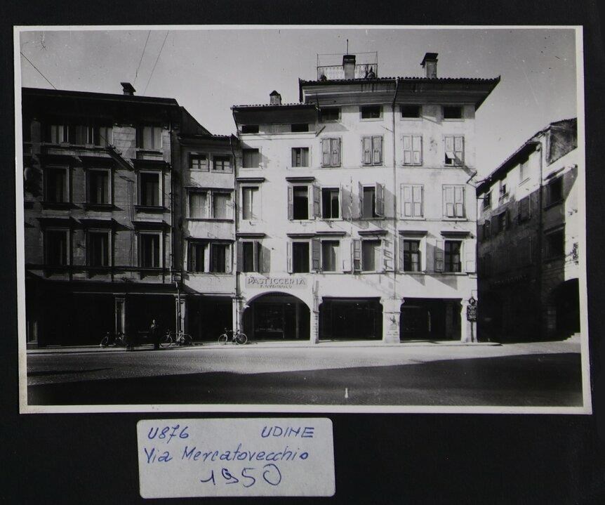 Udine: veduta di uno scorcio di via Mercatovecchio. Al centro, l'insegna di una pasticceria. A sinistra, un signore e tre biciclette.