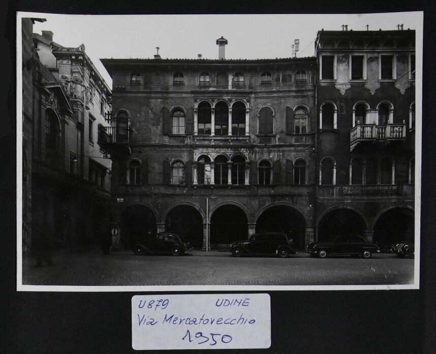 Udine, via Mercatovecchio: al centro Palazzo Sacchia (dei primi anni del Cinquecento), con portico costituito da quattro archi; a destra Palazzo Zorzi, edificato su progetto di Cesare Miani (1923) e sviluppato su tre piani. A sinistra si intravedono il palazzo del Comune o Palazzo D'Aronco (1911-1930) e la Loggia del Lionello, finita di costruire per volere di Nicolò Lionello.