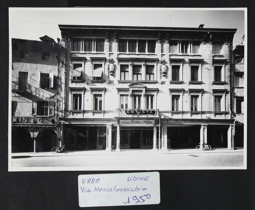 Udine, via Mercatovecchio: Palazzo Fabris-Casa Fornara, sviluppato su quattro piani e realizzato su disegno di Luigi Taddio. A sinistra, il sedime della Cappelleria Comis & C., demolita nel 1963. Successivamente venne costruito lì "Palazzo Rosso" Talmone, dell'architetto Gino Valle. In basso al centro, la sartoria Tessaro e Vidoni, inaugurata nel 1932 in questa via al civico 28. Sopra l'insegna di questa attività, l'insegna relativa a uno studio dentistico.