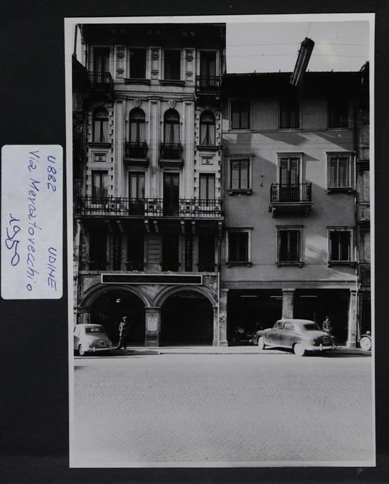 Udine, via Mercatovecchio 20: a sinistra, facciata di Palazzo Sgualdino, edificato su progetto dell'architetto Pietro Zanini (1925-1927). Sviluppato su cinque piani, presenta una facciata con lesene e ringhiera in ferro battuto.