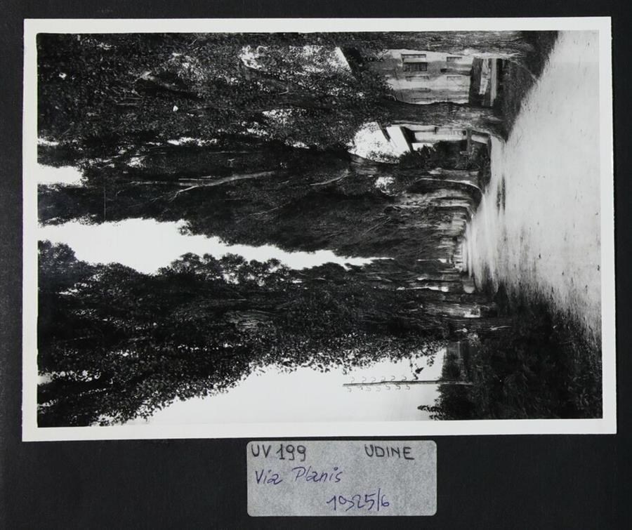 Udine: veduta di via Planis costeggiata da due filari di alberi. A destra si intravede un casolare. In lontananza, nella via, delle persone che camminano.