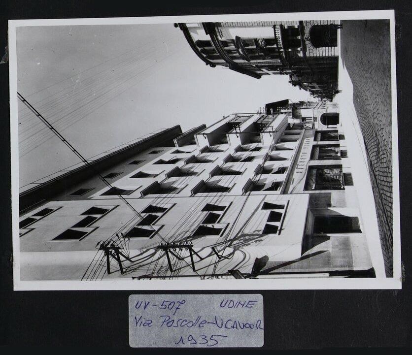 Udine, via Poscolle e via Cavour: a sinistra Palazzo Mulinaris, realizzato su progetto dell'architetto Ermes Midena (1929-1930) e formato da sei piani. Al piano terra è presente un grande magazzino per i tessuti. Vicino, si notino i binari del tram della linea che porta a piazzale XXVI luglio.
