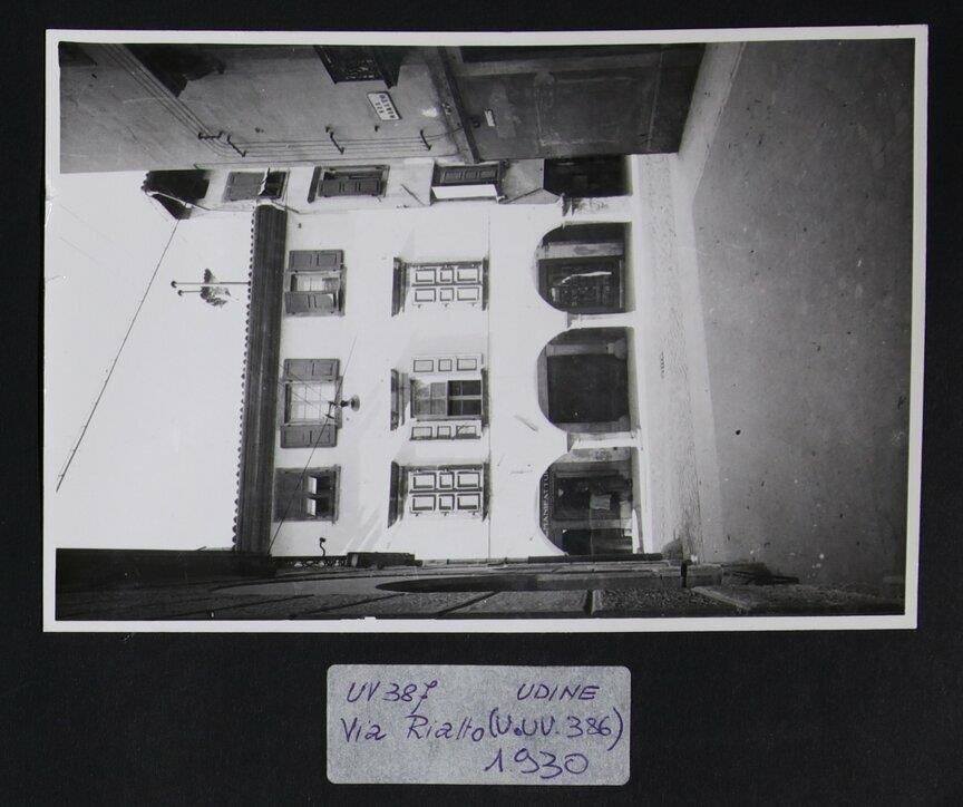 Udine: veduta dalla fine di via Rialto di un palazzo storico posizionato in via Paolo Canciani, demolito prima che venisse eretta la Galleria Bardelli ("Il Lavoratore"). Al piano terra, arcate a tutto sesto. All'estrema destra, in primo piano, è indicata la denominazione di via Rialto.