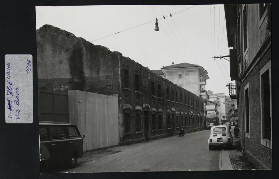 Udine; via Ronchi: sul lato sinistro, edificio in stato di abbandono e di deterioramento, a causa dei bombardamenti della seconda guerra mondiale, e un esemplare di Volkswagen Transporter; a destra, una Fiat 500.