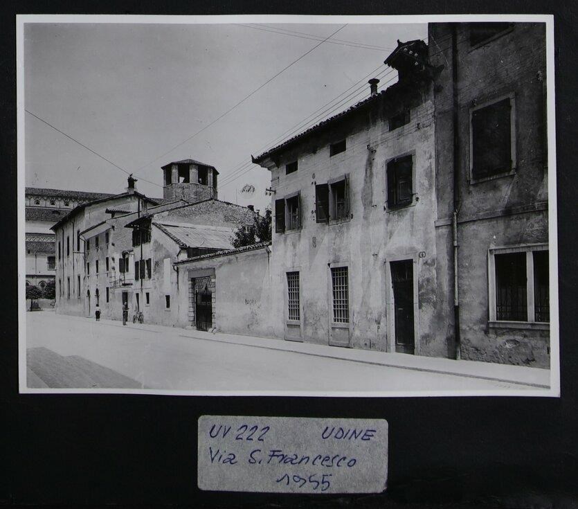 Udine: veduta di via San Francesco con case prossime alla demolizione. Sullo sfondo, a sinistra, uno scorcio del duomo (prima metà del Duecento).