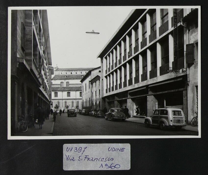 Udine: veduta di via San Francesco. Sullo sfondo, a sinistra, uno scorcio del duomo (prima metà del Duecento). A destra, il Palazzo dell'Associazione Industriali, ex sede di rappresentanza della Regione Friuli Venezia Giulia, realizzato su progetto dell'architetto Pietro Zanini (1951-1953) per accogliere attività commerciali e gli uffici dell'Associazione.