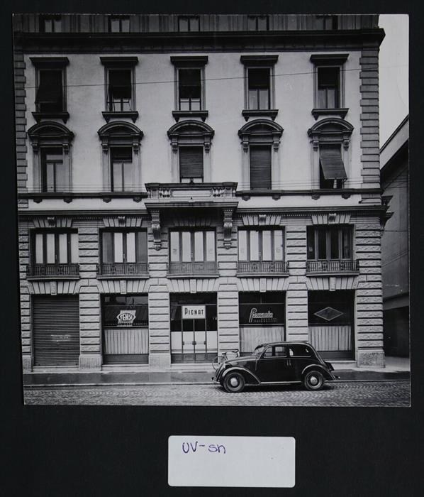 Udine, via San Francesco: palazzo storico con, al piano terra, attività commerciali per la produzione di materiale fotografico gestite dalle aziende Tensi e Ferrania, conosciuta con questa ragione sociale dal 1938. Tra le insegne delle due aziende si colloca l'insegna relativa all'atelier aperto in origine da Luigi Pignat. In primo piano a destra, una FIAT 508 C Nuova Balilla 1100 (in produzione dal 1937).