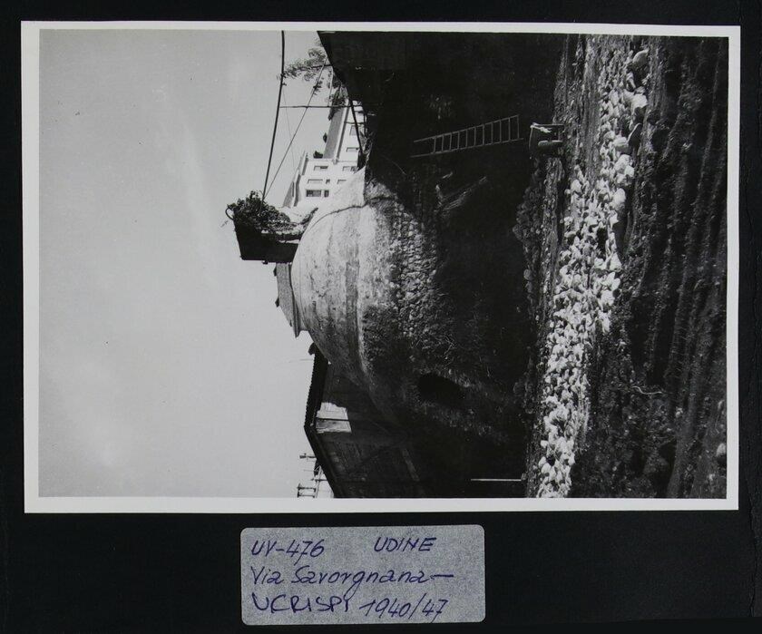 Udine, via Savorgnana: ghiacciaia, demolita nel 1956, situata nei vivai Gasparini, per conservare il ghiaccio e quindi conservare, ad esempio, gli alimenti e certi prodotti. A sinistra, una carriola e una scala in legno.