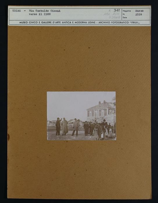 Udine, via Teobaldo Ciconi: gruppo di persone in primo piano e, in secondo piano, cantiere edile e palazzo.