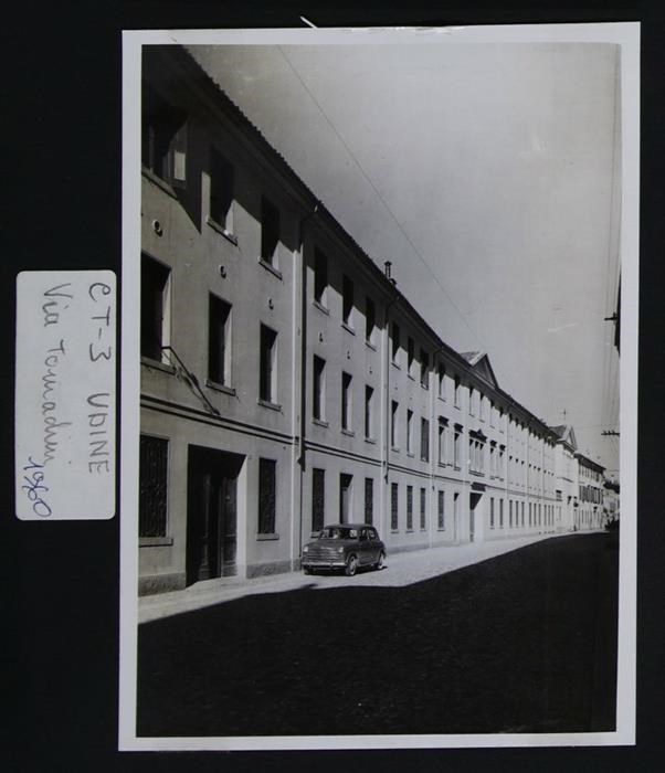 Udine, via Francesco Tomadini: orfanotrofio Tomadini, istituto privato aperto da monsignor Francesco Tomadini (1856). Nel 1836 un'epidemia di colera colpì la città e oltre trecento bambini rimasero senza famiglia. Di conseguenza, una commissione diocesano-comunale assegnò al sacerdote l'incarico di cura degli orfani, trovando la sistemazione definitiva in via Francesco Tomadini. Nel 1960, anno dello scatto, risultava direttore dell'istituto monsignor Isidoro Donato. A destra, la chiesa di San Girolamo Emiliani e San Giuseppe Calasanzio.