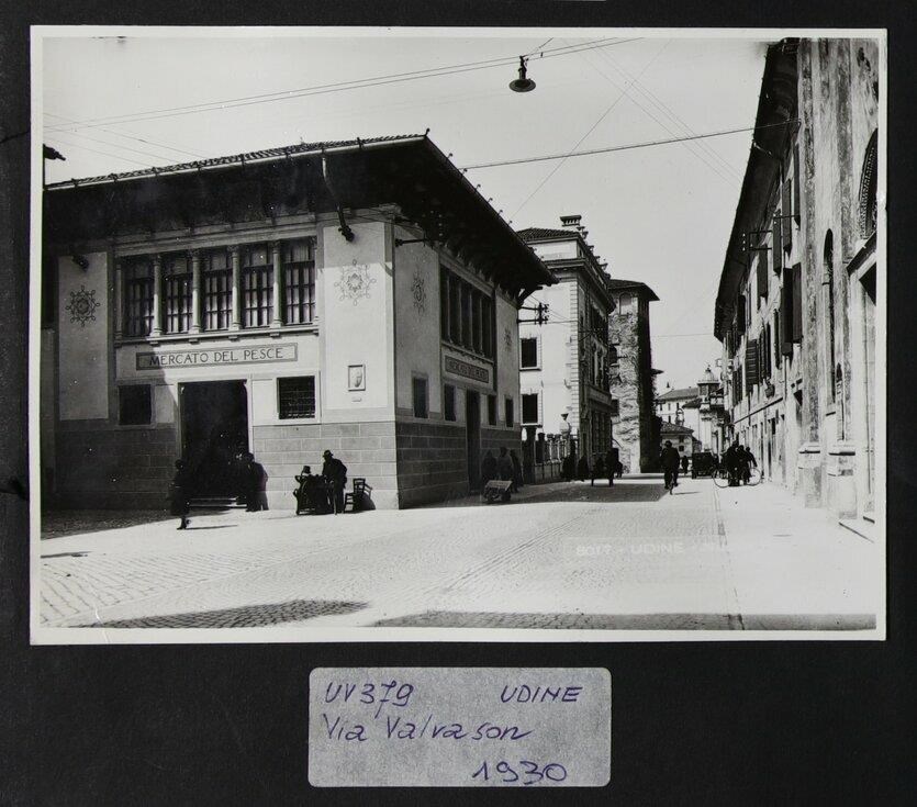Udine, via Erasmo Valvason: veduta, a sinistra, del Mercato del Pesce, poi Galleria Tina Modotti (XVII secolo), edificio in stile liberty che è stato oggetto di interventi da parte dell'ingegnere Davide Badini (1925).