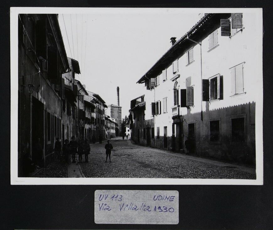 Udine: veduta di via Villalta. In fondo, Porta Villalta (1436-1440), quinta cerchia muraria. Dietro, la ciminiera dello stabilimento della Birreria Dormisch (1892). In primo piano, a sinistra, sei bambini in posa.