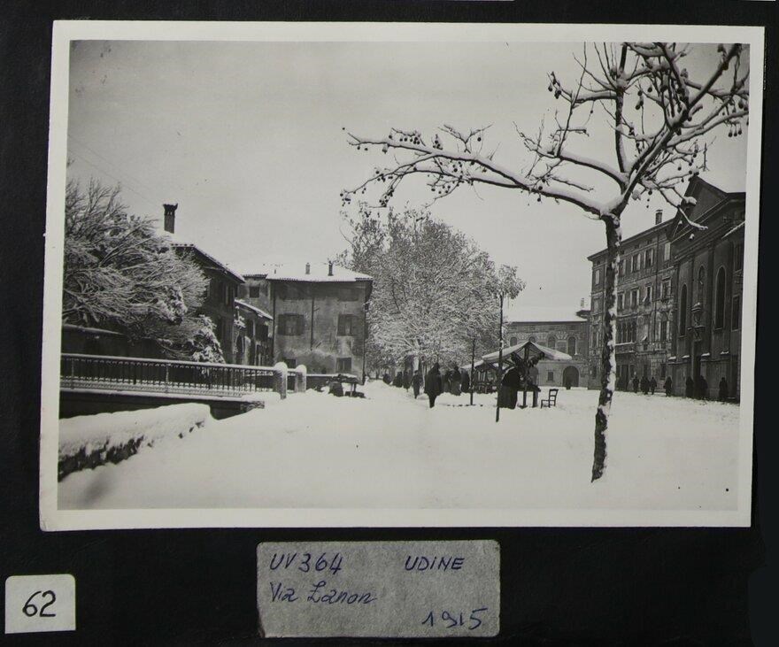 Udine: veduta innevata di via Antonio Zanon con un filare di alberi, la roggia e un piccolo ponte. A destra la chiesa di San Nicolò, demolita nel 1933 (in quel punto successivamente sorse un condominio).