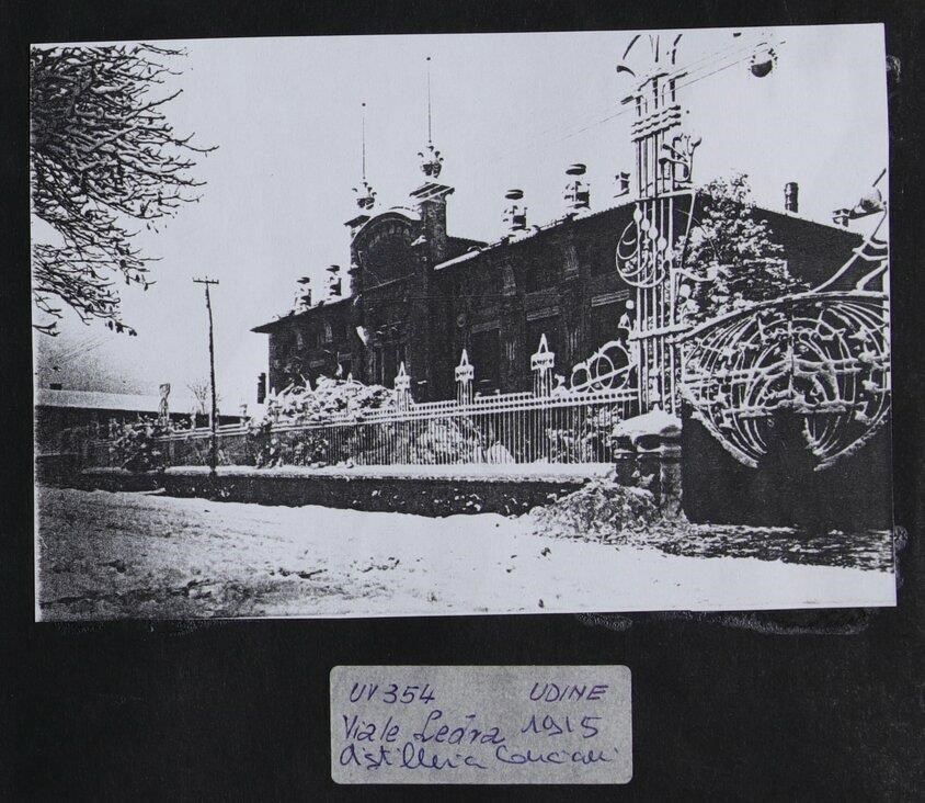 Udine, viale Ledra: veduta esterna, durante una giornata di neve, dello stabilimento produttivo della Distilleria Agricola Friulana Canciani&Gremese. La portineria e la cancellata d'ingresso, risalenti all'Art Nouveau, sono opera dell'architetto Silvio Piccini (1905).