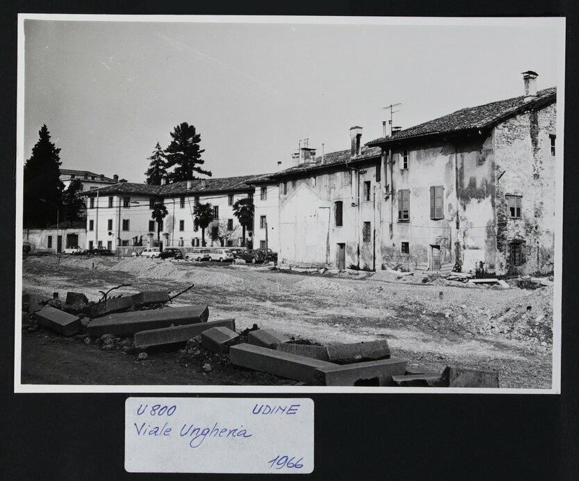 Udine, viale Ungheria: veduta - verso piazza Patriarcato - con abitazioni, la palazzina del Distretto Militare e varie automobili. In primo piano, materiali da costruzione. Si noti che viale Ungheria, essendo ancora in costruzione, stava prendendo forma a seguito dei bombardamenti della seconda guerra mondiale (anni Cinquanta e Sessanta); infatti diverse case vennero abbattute a favore di nuovi interventi urbanistici.