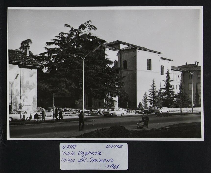 Udine, viale Ungheria: la chiesa di San Bernardino da Siena (1522), oggetto di restauro e ampliamento sia nel Settecento, su progetto di Giorgio Massari - proponendo uno stile neoclassico - sia nel 1950, a causa dei bombardamenti della seconda guerra mondiale. Accanto, il Seminario arcivescovile di Udine "San Luigi Scrosoppi". In primo piano, alcuni operai durante i lavori in corso. Si noti che viale Ungheria, essendo ancora in costruzione, stava prendendo forma a seguito dei bombardamenti (anni Cinquanta e Sessanta); infatti diverse case vennero abbattute a favore di nuovi interventi urbanistici.