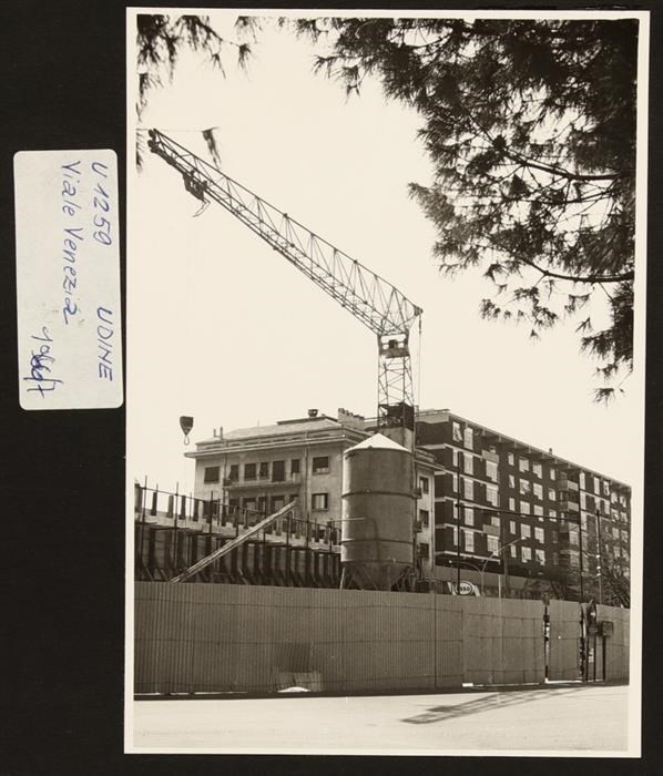 Udine, viale Venezia: cantiere edile in attività con gru e silos. Si può leggere, in basso verso il centro, l'insegna dello stabilimento dell'azienda petrolifera Ɛsso.