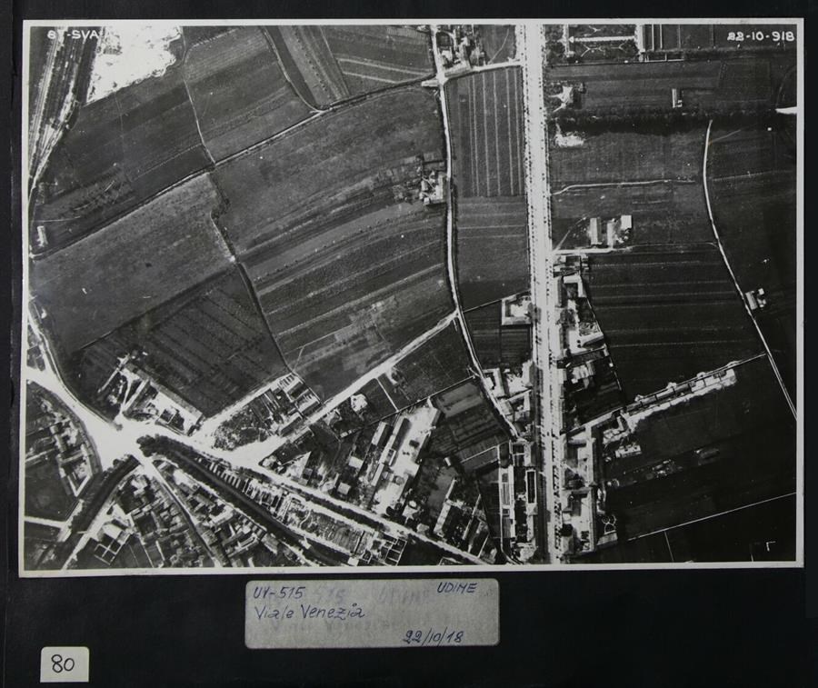 Udine: ripresa dall'alto di viale Venezia. In alto a sinistra, l'iscrizione a mano "87 - SVA [...]". In alto a destra, "22 - 10 - 918". Lo scatto a scopo di ricognizione è stato realizzato verso la fine della prima guerra mondiale da un velivolo Ansaldo S.V.A.