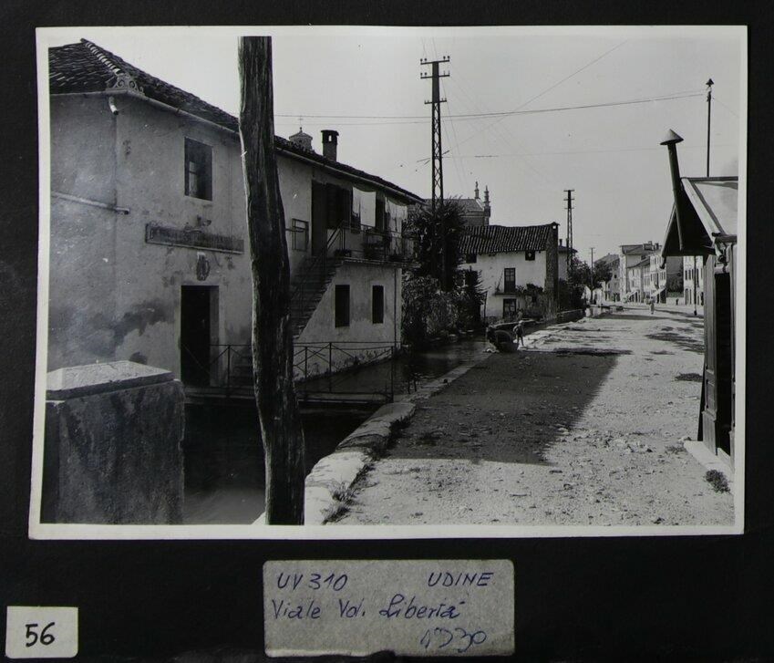 Udine: veduta di viale Volontari Della Libertà con, a sinistra, la roggia di Udine attraversata da un ponte. Verso destra, una donna inginocchiata intenta nelle sue attività con accanto un bambino in piedi.