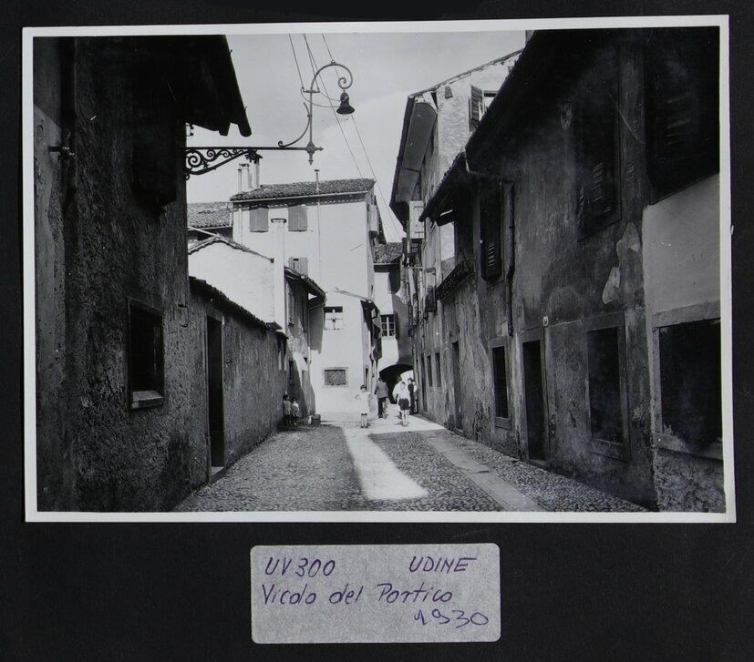 Udine, vicolo del Portico: veduta di vecchie abitazioni con anche, in fondo al centro, quattro bambini. In alto, da sinistra, un lampione.