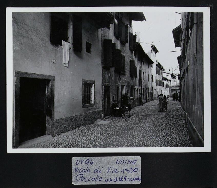Udine: veduta di via del Freddo (si legge, a sinistra, il numero civico, il 2), vicolo di via Poscolle, con dieci persone.
