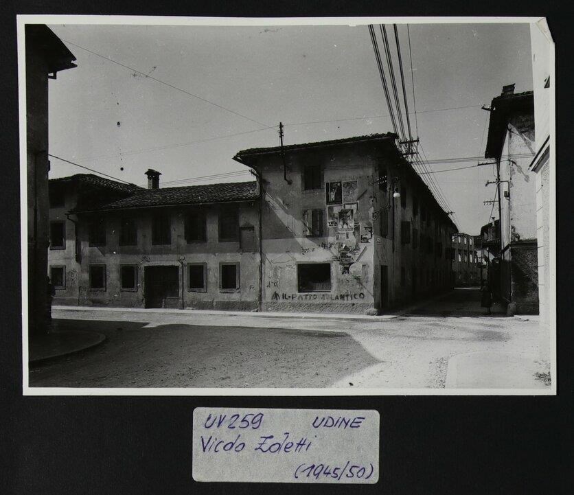 Udine: veduta di via Zoletti, laterale di via Aquileia. Sull'edificio al centro, in basso, la frase scritta sul muro "ABBASSO IL PATTO ATLANTICO" (firmato ad aprile nel 1949) e, sulla parte destra del medesimo, diversi manifesti pubblicitari.