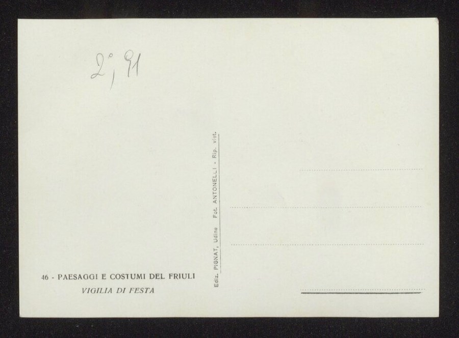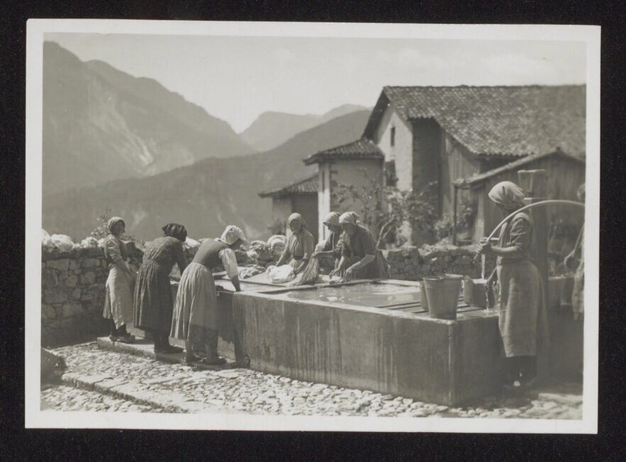 Un gruppo di donne con il costume tradizionale carnico sono ritratte mentre lavano i panni nel lavatoio pubblico di Voltois di Ampezzo. Sullo sfondo si riconosce il Passo di Monte Rest.