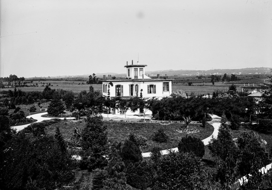 Veduta di una villa con una piccola torre al centro, un giardino curato in mezzo alla campagna di una pianura.