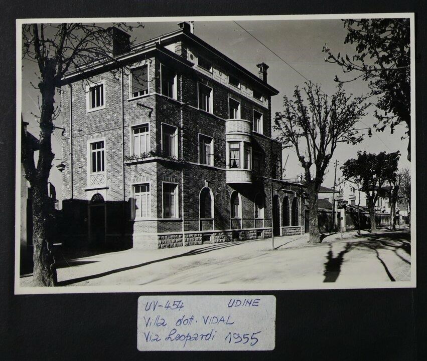 Udine, viale Giacomo Leopardi 18: Villa Vidal dell'architetto Ettore Gilberti (1934), commissionata da Vittorio Vidal e sviluppata su tre piani. Nelle vicinanze altri villini, costruiti dopo che le mura della città vennero abbattute.