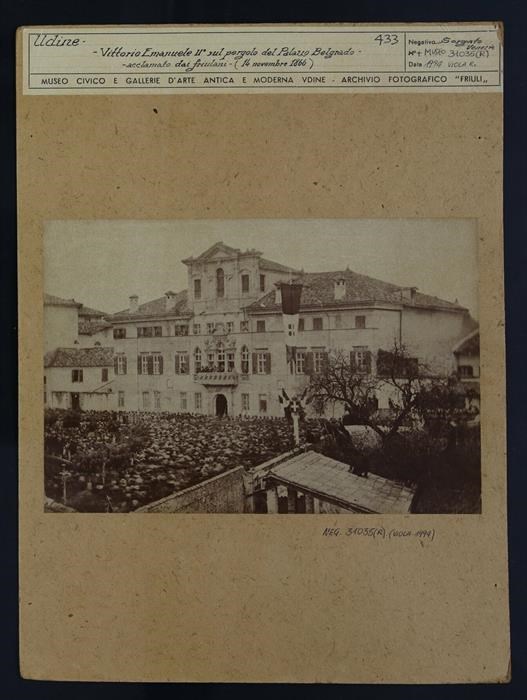 Udine, piazza Patriarcato: veduta di Palazzo Antonini-Belgrado (fine del Seicento), prima di proprietà della famiglia Antonini, poi della famiglia Belgrado. Nel 1891 diventò sede dell’Amministrazione provinciale di Udine. Lo scatto risale al periodo austriaco: sono ben esaltati la bandiera del Regno con il vessillo reale e il vessillo stesso, isolato dal tricolore. Una folla nutrita di persone ascolta le parole del re, sul balcone del palazzo, in visita dopo la Terza Guerra d'Indipendenza e l'annessione del territorio al Regno.