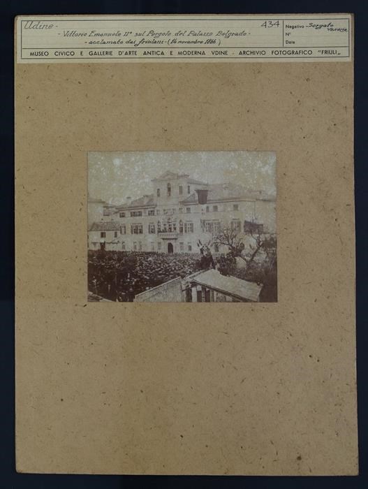 Udine, piazza Patriarcato: veduta di Palazzo Antonini-Belgrado (fine del Seicento), prima di proprietà della famiglia Antonini, poi della famiglia Belgrado. Nel 1891 diventò sede dell’Amministrazione provinciale di Udine. Lo scatto risale al periodo austriaco: sono ben esaltati la bandiera del Regno con il vessillo reale e il vessillo stesso, isolato dal tricolore. Una folla nutrita di persone ascolta le parole del re, sul balcone del palazzo, in visita dopo la Terza Guerra d'Indipendenza e l'annessione del territorio al Regno.