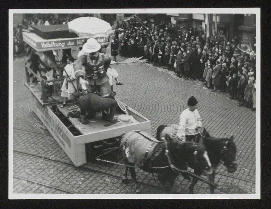 Un momento della sfilata dei carri allegorici nel Carnevale del 1936 della cittadina di Offenbach, città industriale della Germania, nell'Assia, situata sulla riva sinistra del Meno a pochi km da Francoforte.