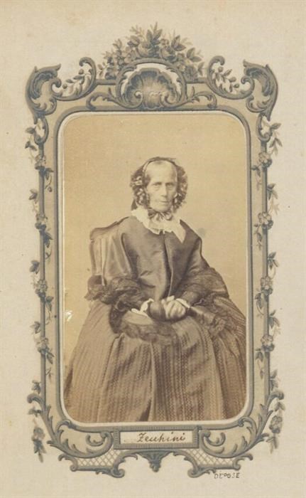 La signora Zecchini, ritratta in studio, con ampio vestito con decori in pizzo e cuffia al capo