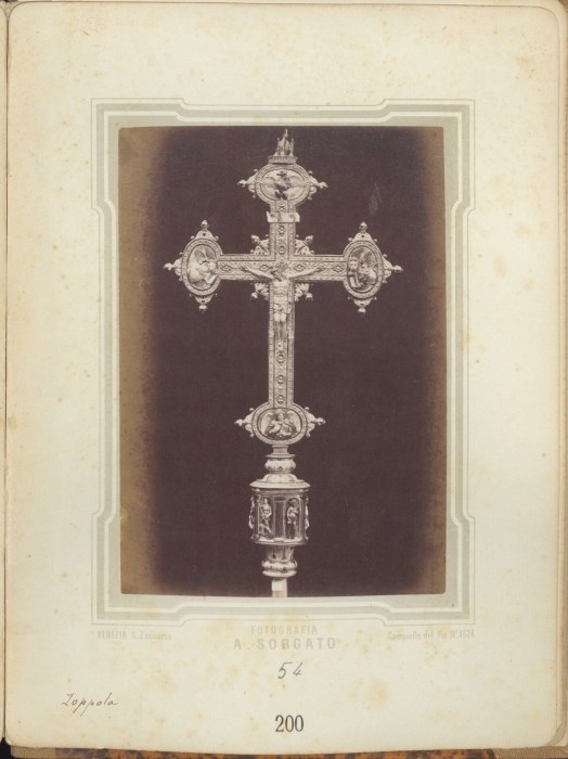 Riproduzione fotografica del fronte di una croce processionale in argento, databile al XVI secolo, conservata presso la Chiesa di San Martino Vescovo a Zoppola. La struttura architettonica del nodo ha nelle nicchie piccole figure di Santi. I lobi della croce sono occupati dai simboli degli Evangelisti. Il verso della croce è riprodotto nella fotografia successiva in album (ID 851)