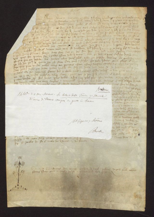 Non sono stati eseguiti interventi di restauro intervento di riparazione con carta moderna a righe su una lacuna dell&39;angolo superiore sinistro che interessa anche lo specchio di scrittura; inchiostro a tratti sbiadito