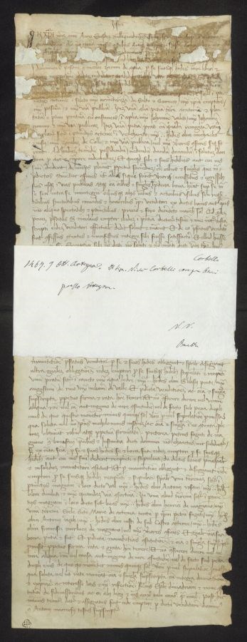 Non sono stati eseguiti interventi di restauro, ma una riparazione con carta antica e colla animale che ha imbrunito il supporto; presenza di lacune