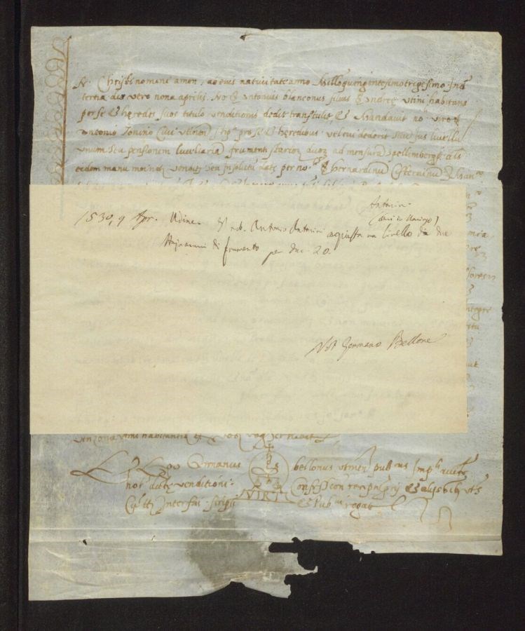 Non sono stati eseguiti interventi di restauro Il bordo inferiore presenta uno strappo significativo, ma non coinvolge il testo del documento
