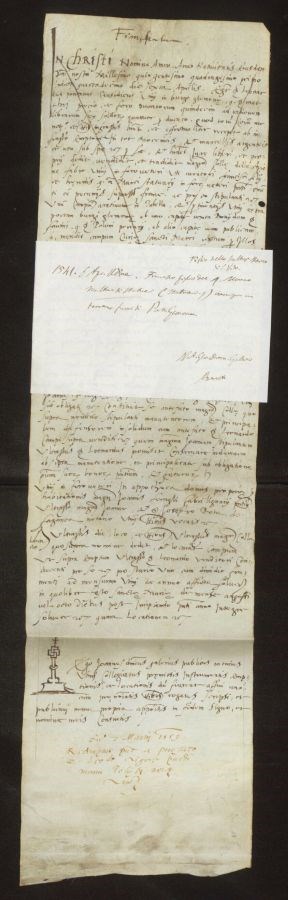 Non sono stati eseguiti interventi di restauro All&39;altezza della tredicesima riga è presente un piccolo foro; inoltre, il documento è depennato