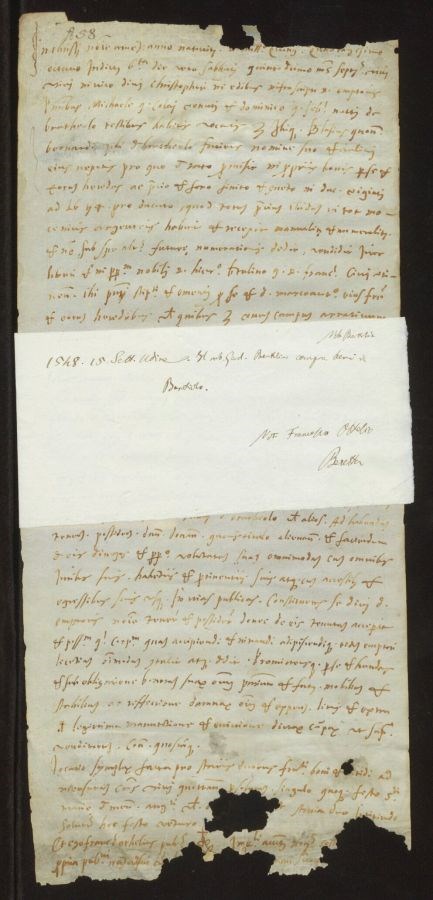 Non sono stati eseguiti interventi di restauro La pergamena presenta strappi significativi sul bordo superiore e soprattutto su quello inferiore, dove anche una parte del testo risulta recisa