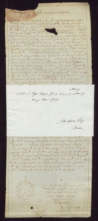 Presenza di un strappo nel lato sinistro superiore e di un foro al centro della parte superiore
