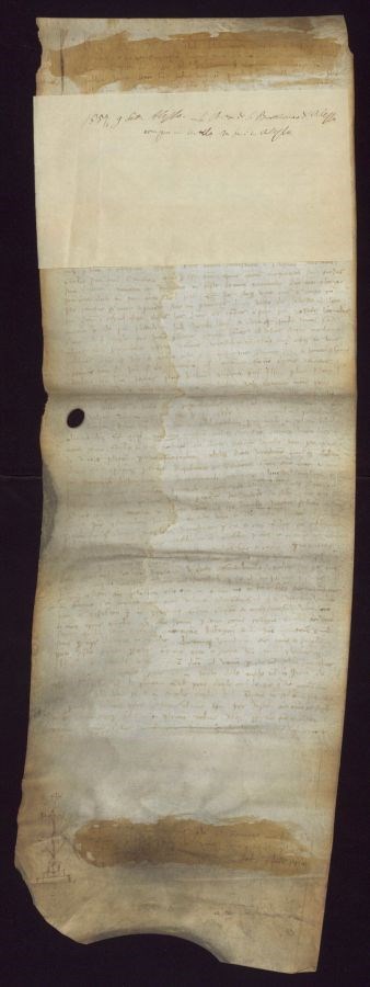Scolorimento dell&39;inchiostro e striscia di acquarello compromettono in parte la lettura dell&39;escatocollo