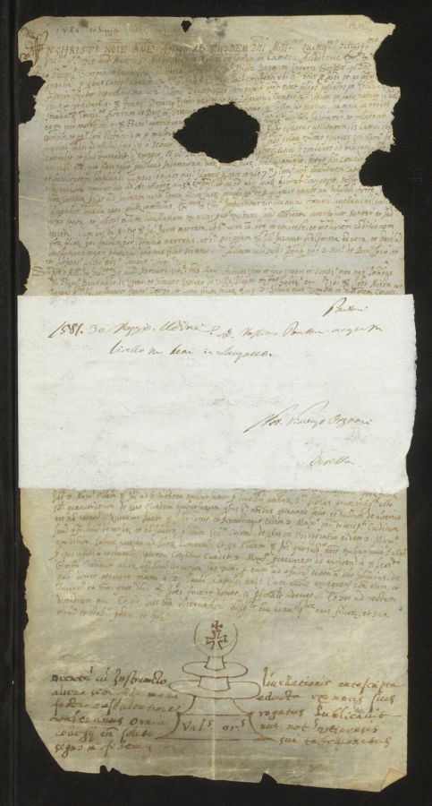 Strappo nella parte centrale con perdita della scrittura
