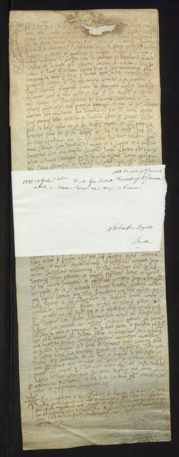 Nella parte lacera e lacunosa della pergamena sul recto superiore è incollata una carta